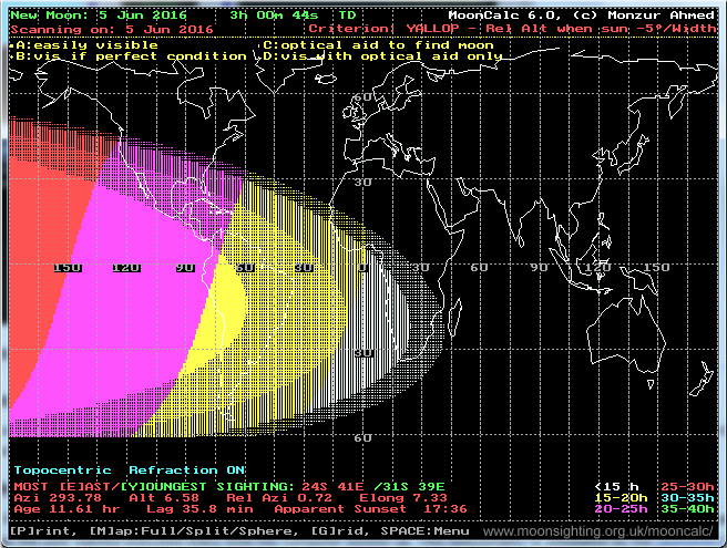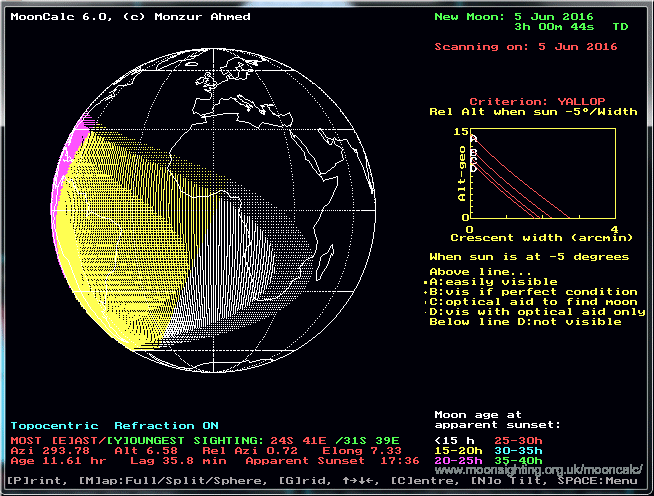 The program can scan the globe at the start of any lunar month to find the location, date/time and circumstances of earliest crescent sighting using a variety of ancient and modern moon sighting criteria. The program is able to draw world maps (flat and spherical projections) showing areas of the globe where the young moon is likely to be seen. Graphical displays showing the position of the moon on a star chart and the position of the moon in a simulated local sky (horizon view or traditional circular sky-chart view) can be produced and printed out. A close-up of the near side of the moon (showing orientation of the moon's limbs and position of the lunar craters), correct for a given observation site, is also provided. This close up takes into account the effect of libration and 'limb shortening' (optional). A graph of lunar libration for an entire month can be plotted. There is a choice of either topocentric/geocentric co-ordinates and apparent/geometric sunset. Correction for atmospheric refraction is optional. The program has a built in atlas database which stores latitude and longitude data of upto 1000 cities (ships with over 100 cities already entered). There are many user-configurable features. MoonCalc and accompanying documentation and files are copyright by Dr. Monzur Ahmed, © 1993/ 2015. All rights reserved |